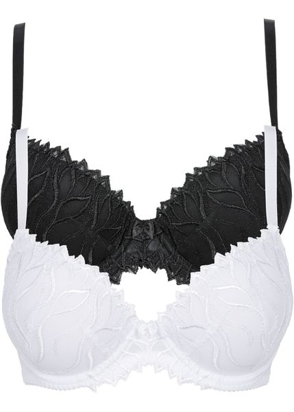 Bardzo kobiece biustonosze z koronką. W komplecie 2 biustonosze z kolekcji Bodyflirt, przekonujące swoim romantycznym designem. Usztywniane, wyściełane miseczki na fiszbinach kształtują piękny dekolt. Ozdobna kokardka na mostku i miseczkach. Pomiędzy miseczkami dekoracyjna kokardka. Zapięcie i ramiączka szersze w większych rozmiarach.