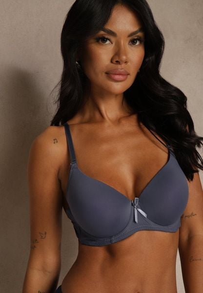 Granatowy Gładki Biustonosz o Klasycznym Fasonie Zdobiony Kokardką Caloris