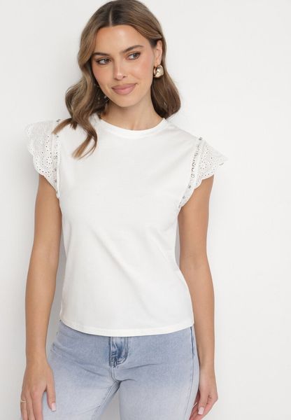 Biała Bluzka z Bawełny z Ażurowym Wzorem i Cyrkoniami Naladora