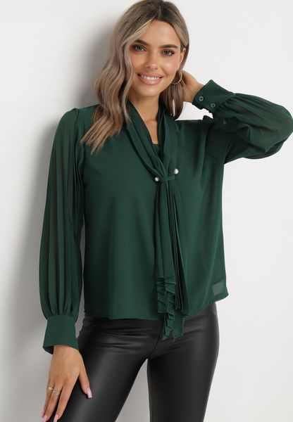 Ciemnozielona Bluzka z Krawatką i Plisowanymi Rękawami Woldu