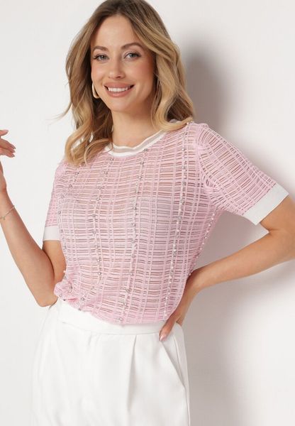 Różowa Bluzka z Wiskozy Ozdobiona Cyrkoniami i Perłami Eioratia
