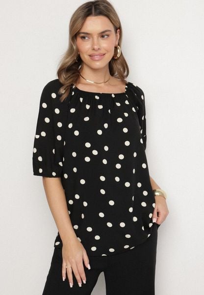 Czarna Bluzka ze Sztucznego Jedwabiu w Kropki z Dekoltem Łódką Lisavina