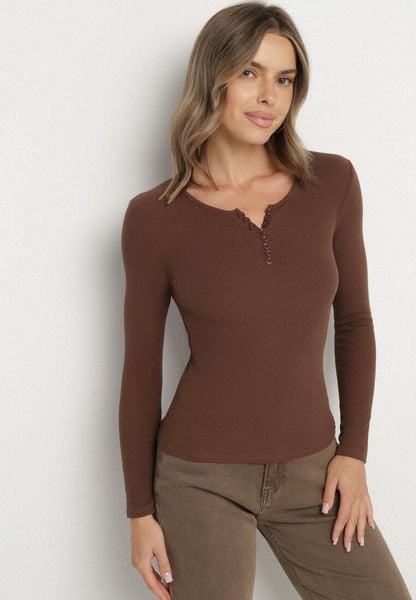 Brązowa Bawełniana Bluzka Longsleeve z Prążkowanej Tkaniny z Guziczkami Amandria