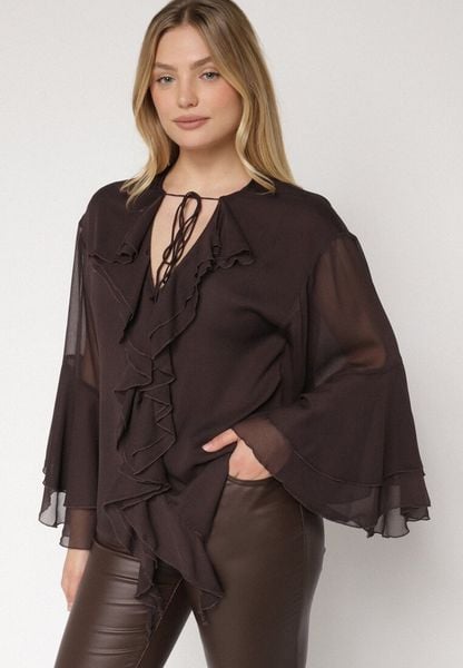 Brązowa Bluzka w Rustykalnym Stylu z Wiązaniem i Falbankami Nenarea