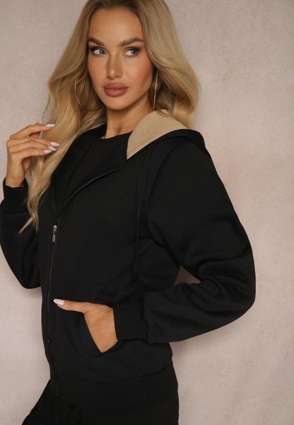 Czarna Bluza Rozpinana z Dodatkiem Bawełny Ozdobiona Kontrastowym Kapturem Arstoia