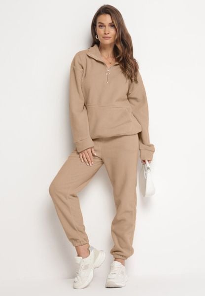 Beżowy 2-częściowy Polarowy Komplet Dresowy z Bluzą i Szerokimi Spodniami Aldonor