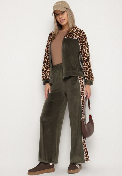 Zielony Komplet Dresowy Welurowy Szerokie Spodnie i Bluza w Panterkę Aznelie