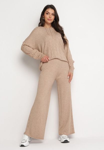 Beżowy Dzianinowy Komplet Bluza z Kapturem w Warkoczowy Splot i Spodnie z Szerokimi Nogawkami Narahai