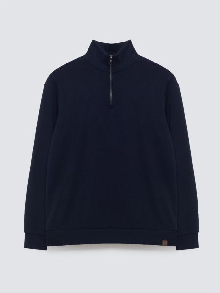 Męska bluza ze stójką w granatowym kolorze. Standardowy krój. Wykonana z przyjemnej dzianiny z domieszką wiskozy. Ściągacz przy rękawie i na dole. Logowanie w formie skórki z logo marki.