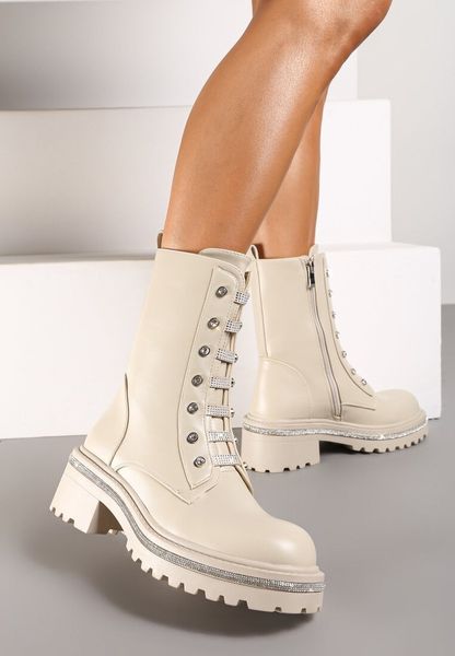 Beżowe Botki Workery na Platformie Ozdobione Cyrkoniami Zinetta