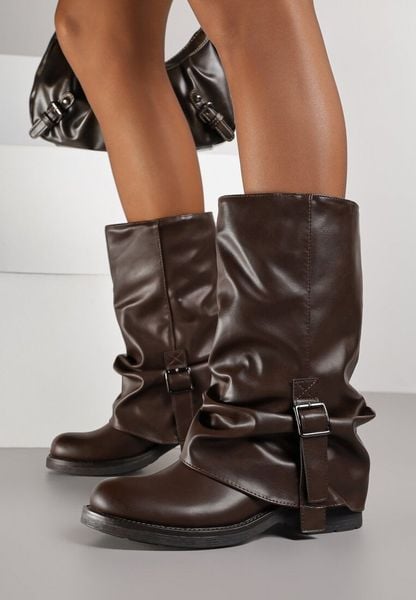 Brązowe Botki z Wywiniętą Marszczoną Cholewką Typu Biker z Paskiem Olinessa