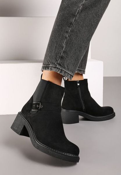 Czarne Botki na Słupku w Stylu Sztybletów z Klamrą Riviona