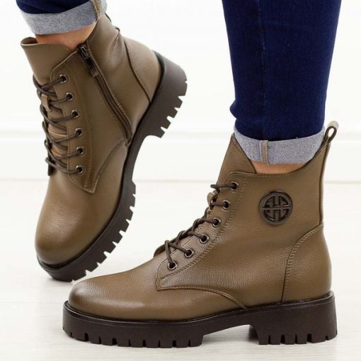 Khaki trapery damskieto praktyczne i modne obuwie na chłodną jesień oraz zimę, które świetnie łączy wygodę, trwałość i nowoczesny design. Wykonane z wysokiej jakości materiału skóropodobnego, prezentują się stylowo i uniwersalnie. Cholewka została ozdobiona subtelną metalową dekoracją, co dodaje butom charakteru i nowoczesnego wyglądu. Zapinane na suwak oraz dodatkowo sznurowane, zapewniają idealne dopasowanie do stopy […]