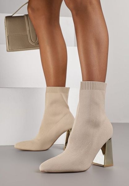 Ciemnobeżowe Skarpetkowe Botki VICES na Słupku w Eleganckim Stylu Rarana