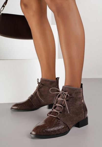 Brązowe Sznurowane Botki do Kostki Vices Zdobione Tłoczeniem Skóry Węża Wedvire