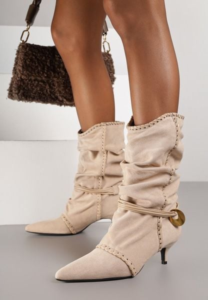 Beżowe Botki na Kaczuszce Slouchy Ozdobione Metaliczną Aplikacją i Sznurkiem Avodvire