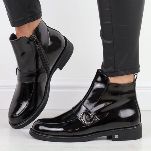 Czarne lakierowane botki damskie:są pełnowartościowe w I gatunkusą starannie wykonane oraz odznaczają się wysoką trwałościąwkładka i wnętrze jest lekko ocieplonemaja elastyczną podeszwęobcas: 3.2 cm, spód: 1.2 cm Kolor: Czarny lakier GWARANCJA na 12 miesięcy