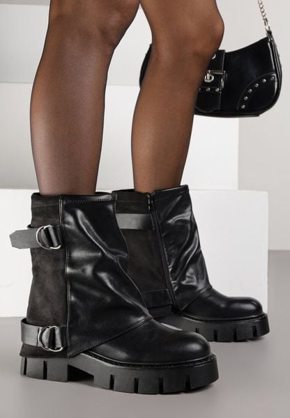 Czarne Botki z Imitacji Zamszu Zdobione Klamrami na Paskach przy Cholewce Nevarina