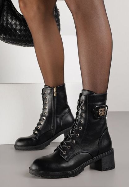 Czarne Botki Vices o Fasonie Trzewików na Słupku Zdobione Aplikacją Nuvitte