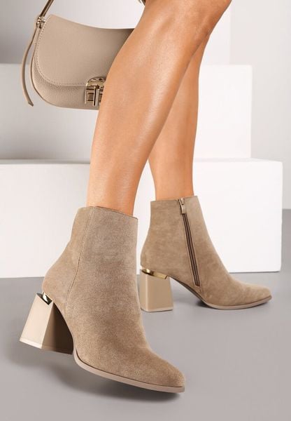 Ciemnobeżowe Botki z Ekozamszu na Niskim Obcasie Zdobionym Metaliczną Wstawką Brievia