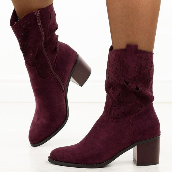Bordowe zamszowe ażurowe botki damskie na obcasie M.Daszyński 2337-12