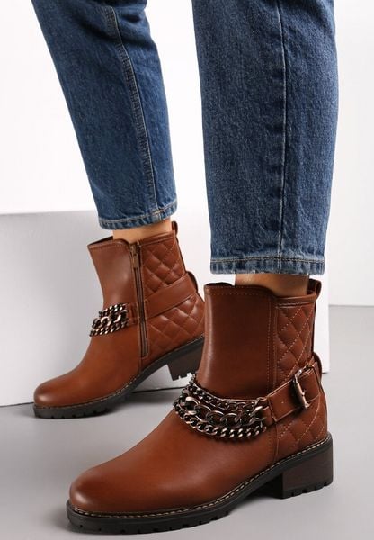 Brązowe Botki za Kostkę z Łańcuszkami i Pikowaniem Lindiia