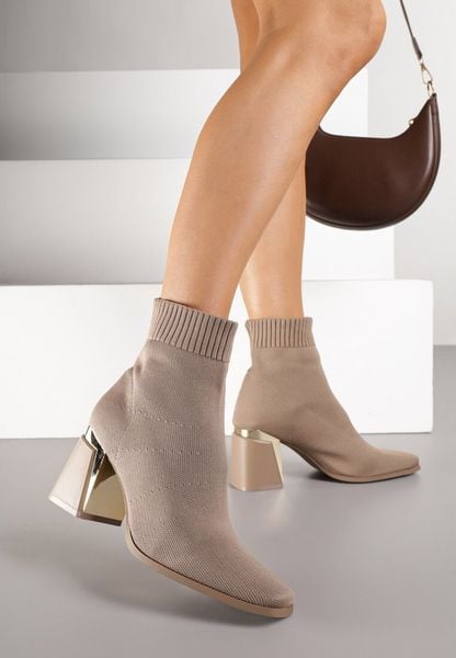 Ciemnobeżowe Botki z Elastyczną Cholewką za Kostkę na Geometrycznym Słupku Amori