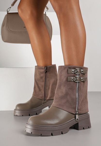 Brązowo-Szare Skórzane Botki Bikery Ozdobione z Wywiniętą Cholewką Klamrami i Suwakiem Adirrive