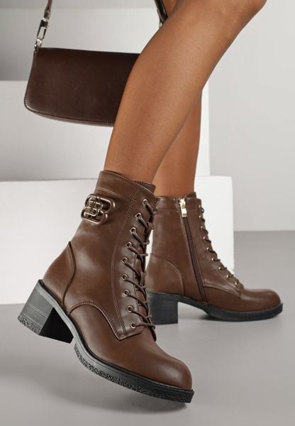 Brązowe Botki Trzewiki Vices na Słupku Zdobione Metaliczną Aplikacją Nivitte