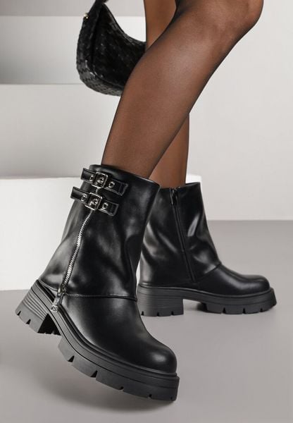 Czarne Botki Biker na Platformie z Wywiniętą Cholewką z Suwakiem i Klamerkami Selade