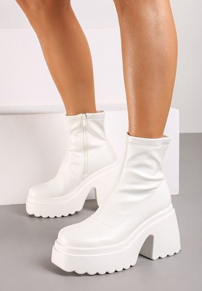 Białe Botki na Obcasie i Platformie z Dopasowaną Cholewką Zapinane na Suwak Reliefra