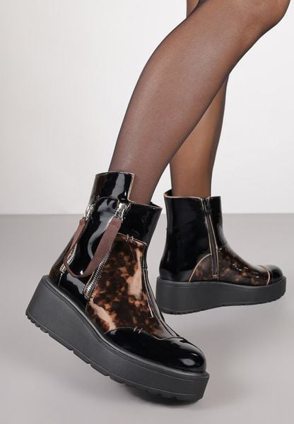 Czarno-Brązowe Lakierowane Botki Vices na Platformie i Koturnie Gamillia