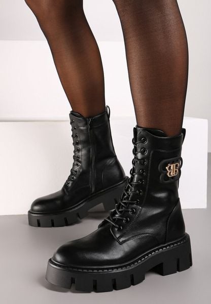 Czarne Botki na Platformie z Wycięciami ze Złotą Aplikacją Irissie