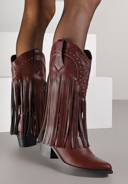 Bordowe Botki Kowbojki na Obcasie Zdobione Nitami i Frędzlami Calles
