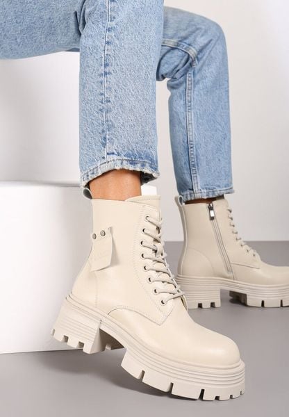 Beżowe Skórzane Płaskie Botki w Stylu Workerów ze Sznurowaniem i Naszywką z Nitami Creora