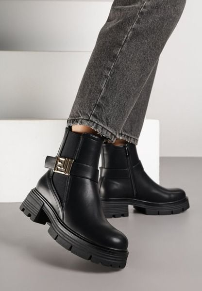 Czarne Botki Typu Sztyblety na Grubej Podeszwie Zdobione Paskiem z Klamrą Maziara