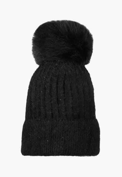 Czarna Czapka z Wiskozą Ozdobiona Futrzanym Pomponem i Metaliczną Nicią Cedige