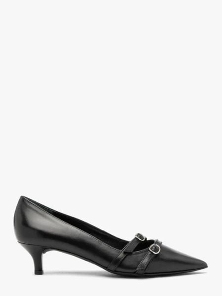 Czarne Czółenka ze Szpiczastym Noskiem na Obcasie Typu Kaczuszka Ozdobione Klamrami Asinelle