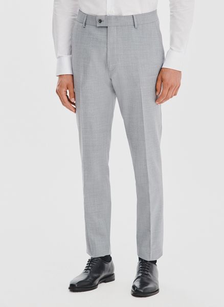 Szare spodnie garniturowe – Pako Lorente. Jasne spodnie garniturowe. Spodnie w kant. Garnitur biznesowy. Skład: 66% wełna, 28% poliester, 6% inne. Fason Super Slim.