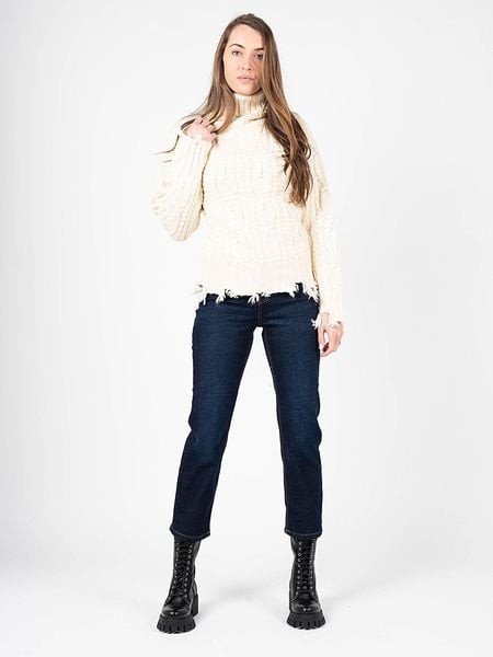 Dopasowany fason (Slim)Delikatnie rozszerzane nogawkiWysoki stanZapinane na zamek oraz logowany guzikZ przodu trzy kieszenie, z tyłu dwie Stebnowane jasną niciąWykonane z wysokiej jakości tkaninyWyprodukowane we Włoszech