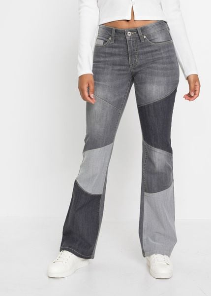 Modne dżinsy dzwony w patchworkowym designie.