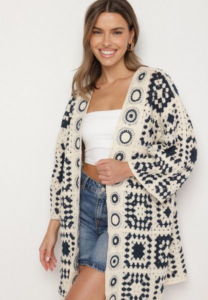 Granatowo-Beżowy Bawełniany Kardigan z Ażurowym Wzorem Meliorra