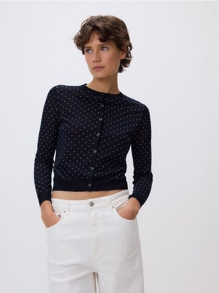Kardigan o prostym kroju, wykonany z dzianiny z wiskozą oraz metaliczną nitką.