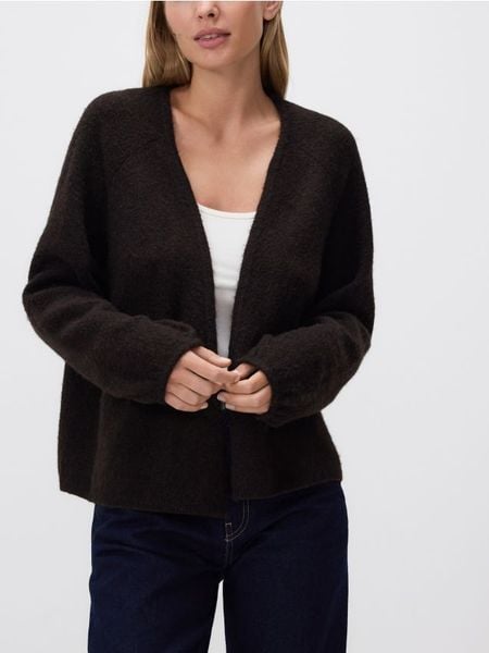 Kardigan o swobodnym kroju, wykonany z dzianiny z dodatkiem wełny.