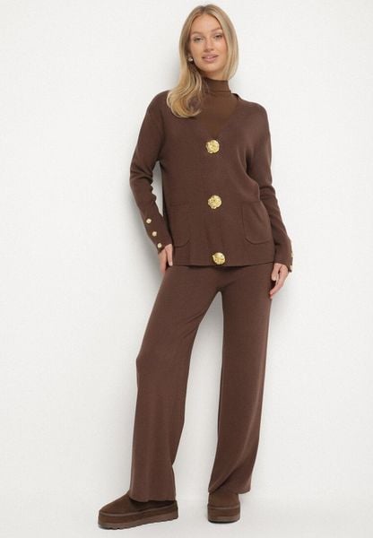 Brązowy Dzianinowy Komplet z Wełną Kardigan Top i Szerokie Spodnie Daivonne