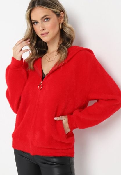 Czerwony Wełniany Kardigan z Kapturem i Suwakiem Sakiyah