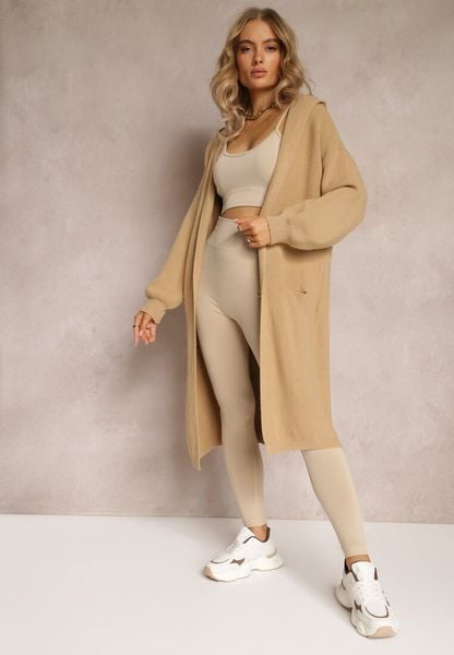 Beżowy Jednolity Kardigan z Długim Rękawem Niezapinany z Kapturem Colise