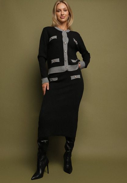Ciemnoszary Dzianinowy Komplet z Wełną Spódnica z Gumką i Kardigan na Guziki Colzina