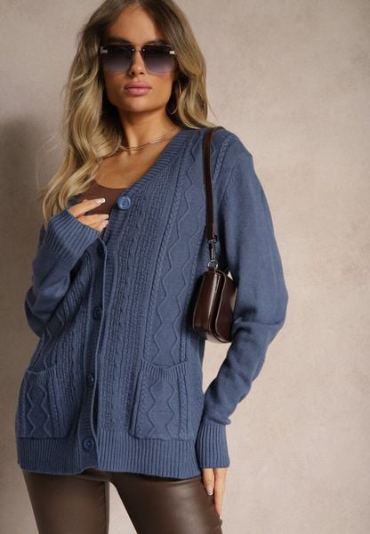 Niebieski Kardigan z Bawełną Zdobiony Warkoczowym Splotem i Kieszeniami Mevesava