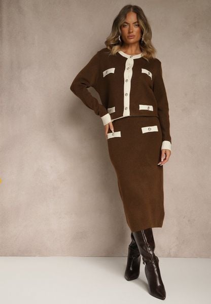 Brązowy Sweterkowy Komplet z Dzianiny z Bawełną Kardigan i Spódnica Derrive
